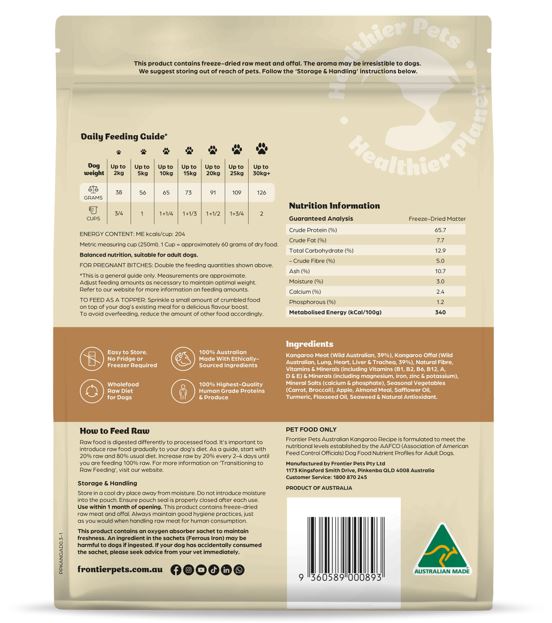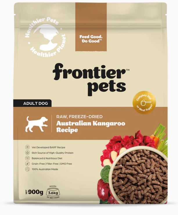 Introducing our newest addition to the Frontier Pets Freeze-Dried Dog Food range. A Premium Single Protein recipe specifically formulated for all breeds of adult dogs and sourced from wild caught, human grade Australian Kangaroo.
